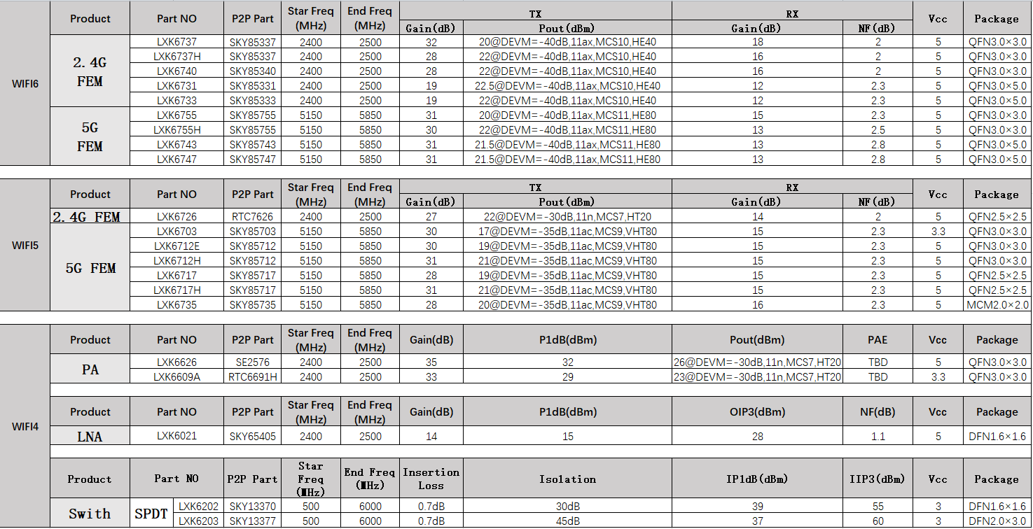 雷迅科WIFI射頻芯片,提供了基于 IEEE 802.11 N/AC/AX的各種FEM芯片,應(yīng)用于2.4G/5.8G/6G不同的路由器等設(shè)備。芯片封裝有QFN3.0*3.0,QFN2.5*2.5,MCM2.0*2.0等封裝形式。為路由器、GPON、筆記本電腦、智能手機等設(shè)備提供WIFI系統(tǒng)的射頻解決方案。